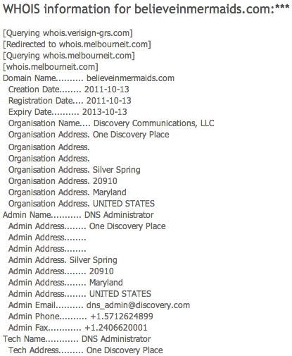 The next question is who owns the website? By looking at the WHOIS information at http://whois.net/, I can see believeinmermaids.com is owned by Discovery Communications, LLC. Ok, so the Discovery Channel created the believeinmermaids footage the week of the filming. Pretty obvious it was created to drive attendance to the film rather than be a real website featuring controversial evidence.