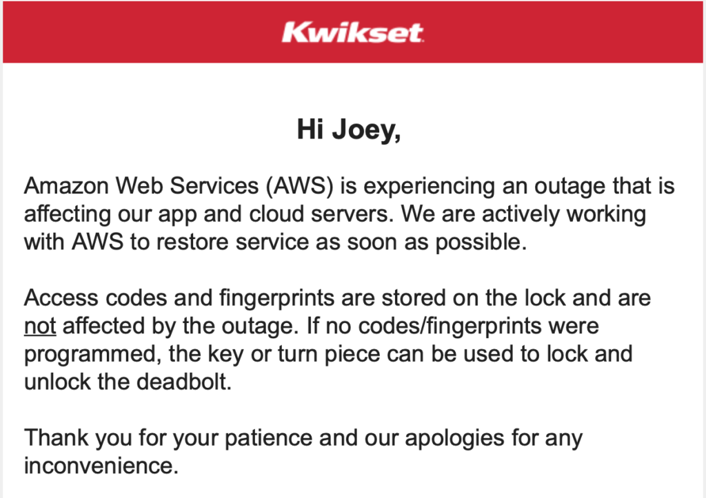 I’m sure many of you use Amazon cloud services directly or indirectly. Today I was trying to work on a few security tools and found the cloud management systems was done. I also found one of my door lock management tools had service interruptions as shown in the next image.