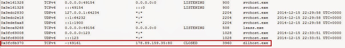 One area with malware indications is network activity are for unusual processes. @lstaPee alluded to this in their tweet about Poweliks. The Volatility netscan plug-in does show network activity for the dllhost.exe process involving the IP address 178.89.159.35 on port 80 for HTTP traffic. dllhost.exe is not a process typically associated with web traffic so this makes it a good indicator pointing to Poweliks.