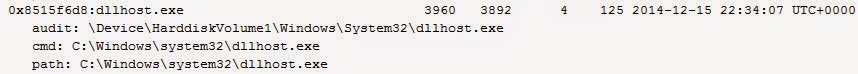 Another area with malware indications is the process listing showing unusual ones or ones with unusual commands. The Volatility pslist, psscan, and pstree -v plugins did not reveal anything that could definitely be used as an indicator but they did show the dllhost.exe process running. I checked a few clean systems to see if dllhost.exe normally runs but the process was not running by default. This doesn’t mean it can be used as an indicator because there could be other reasons for dllhost.exe running besides Poweliks. The screen below is from the pstree plug-in showing the command-line for launching dllhost.exe (notice there are no other options used in the command.)