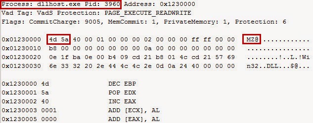 Looking for processes with injected code is an effective technique to locate malware on a system. This is the one technique that absolutely reveals Poweliks on a system. The Volatility malfind plug-in showed the dllhost.exe process with injected code. This matches up to the articles about the malware and behavior analysis showing code does get injected into the dllhost.exe process. The image below shows the partial output from malfind.