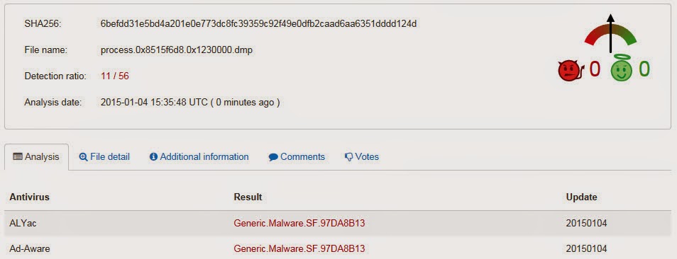 Extracting the injected code and scanning it with antivirus confirms it is Poweliks. The image below shows the VirusTotal results for the injected code. Microsoft detected the code as Trojan:Win32/Powessere.A which is their classification for Poweliks.