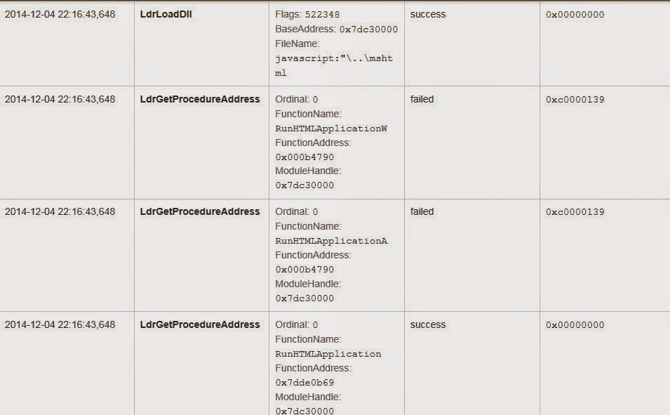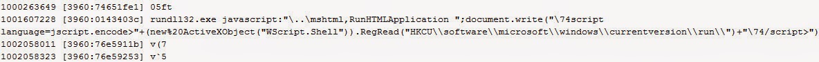 The image below shows activity that occurs shortly after the rundll32.exe process starts. As can be seen, rundll32.exe attempts to load a module into its own address space with the LdrLoadDll function. The module being loaded is actually javascript; this behavior is well documented for Poweliks such as in the article Poweliks – Command Line Confusion. Notice the activity following the LdrLoadDll function call is trying to locate the address for the RunHTMLApplication function. Here’s the keyword Adam pointed out.