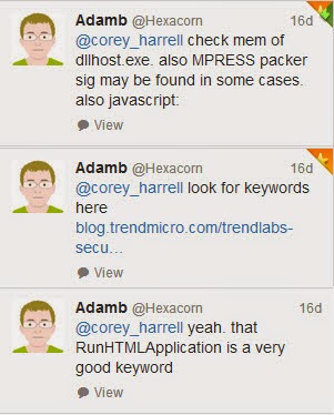 In my RSS feeds, I was following the various articles about how an exploit kit incorporated the use of fileless malware. The malware never gets dropped to the disk and gets loaded directly into memory. A few of the articles I’m referring to are: Poweliks: The file-less little malware that could, Angler EK : now capable of “fileless” infection (memory malware), Fileless Infections from Exploit Kit: An Overview, POWELIKS: Malware Hides In Windows Registry, and POWELIKS Levels Up With New Autostart Mechanism. Reading the articles made one thing clear: one of the most effective tools to deliver malware (exploit kits) is now using malware that stays in memory.