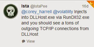 @lstaPee provided a few more tidbits. RunDll32.exe injects code into the Dllhost.exe and dllhost.exe should have network connections. The response I got back from Twitter was great but I really needed to address the bigger question. If and when I have to triage a system infected with Poweliks what is the fastest way to perform the triage to locate the malware and determine the root cause of the infection. A question I needed to dig in to in order to find out the answer.
