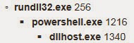 Upon a system’s initial infection, the malware calls rundll32.exe which then calls powershell.exe who injects code into the dllhost.exe process. In the image above the numbers are for the process IDs and this relevant as we dig deeper into the behavior.