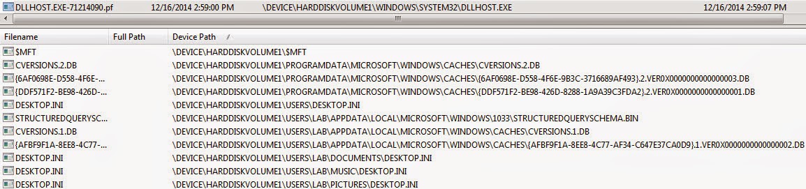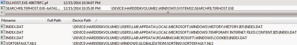 This specific prefetch file sequence only occurs upon the initial infection. Future system restarts where Poweliks is loaded into the dllhost.exe process only shows the dllhost.exe prefetch file. The file references in this prefetch still show references to files located in the user profile.