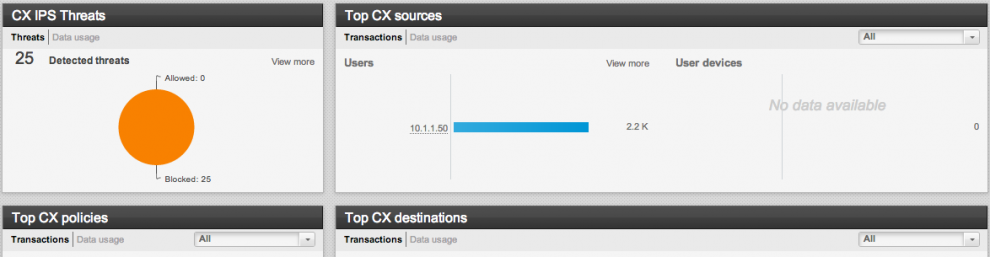 The CX GUI has five major tabs in the local PRSM GUI. The Dashboard tab showcases a breakdown of network traffic including Internet sources, destinations, category violations, malicious traffic, etc. The next screenshot is just a sample of the wealth of data obtained about user traffic.