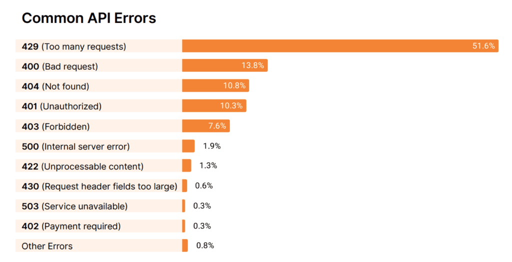 - 1 error: Too many requests – Over half (51.6%) of API error rates comprised “Too Many Requests” (429 errors)
