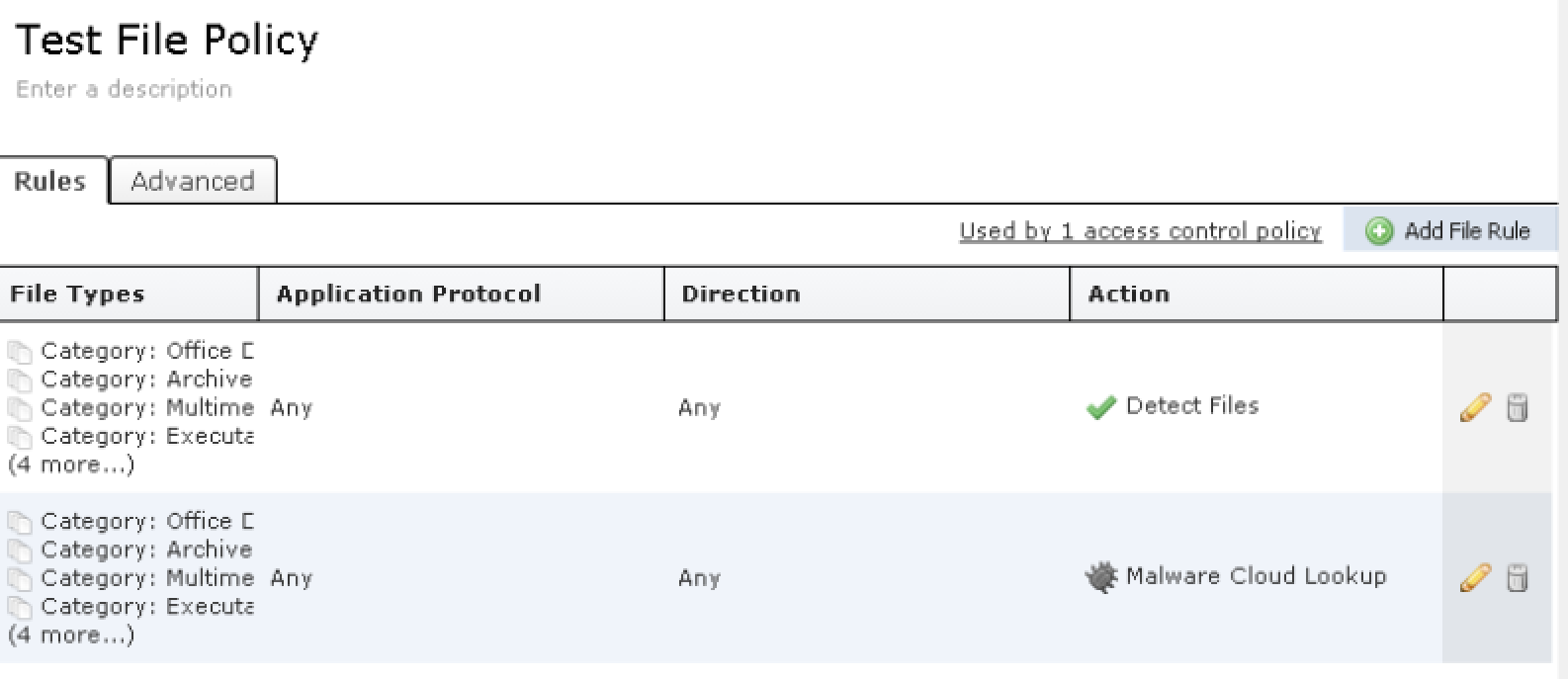 Apply that and now lets crate a second file rule by again clicking Add File Rule. This time we will do the same thing however use the action of Malware Cloud Lookup. Go through getting all file types added and save that. Now you should have two file rules under your file policy as shown.