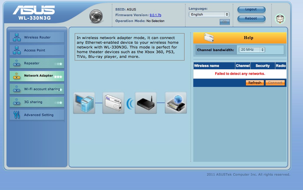 The ASUS comes with a power adaptor however can be powered using USB (awesome). Once powered on, connect it using the Ethernet port and access its GUI using 192.168.1.1 (The ASUS will provide you DHCP address). Log in to 192.168.1.1 with admin admin and you will be presented with six different configuration options as explained earlier. Once you chose one, you will see the GUI below. Its pretty straight forward to setup.