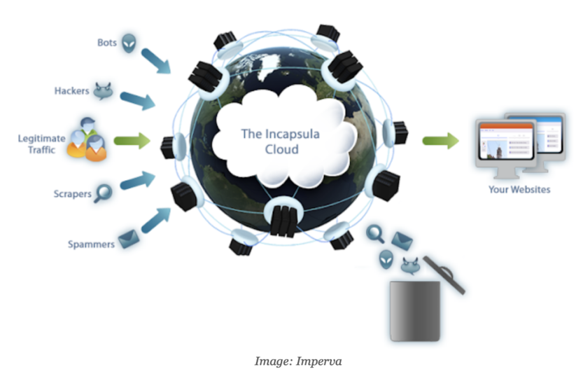 Companies that use the Incapsula WAF route all of their Web site traffic through the service, which scrubs the communications for any suspicious activity or attacks and then forwards the benign traffic on to its intended destination.