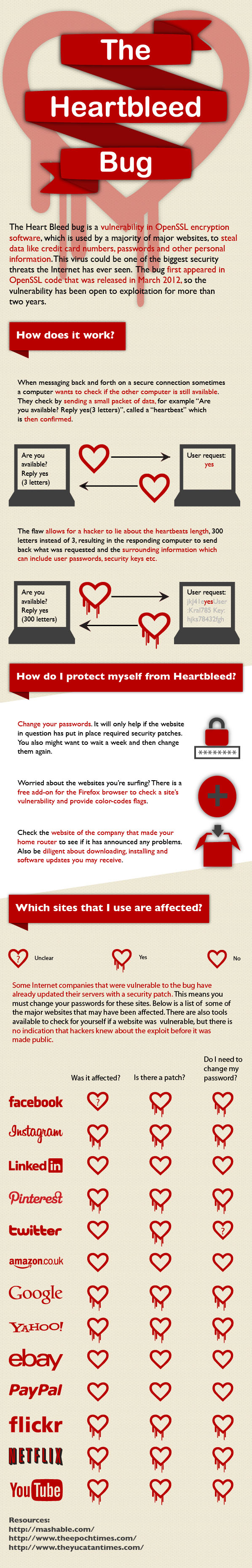 The people at IDF Marketing created a infographic covering the recently announced Hearthbleed bug. You can find more on IDF Marketing HERE. Check out this overview including a list of popular sites with heartbleed vulnerability status.