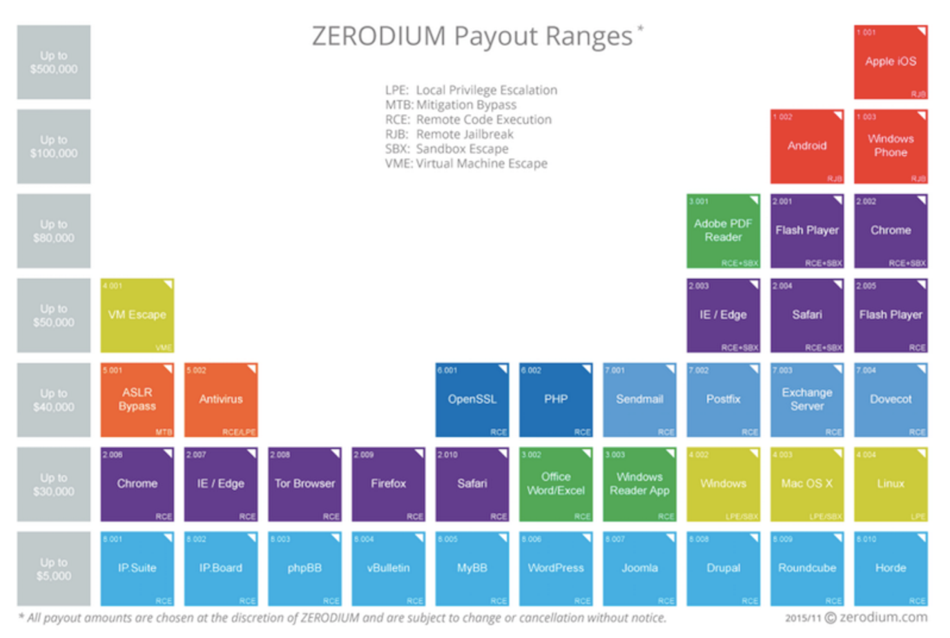 Zerodium’s full chart of payouts it offers for different zero-day hacking techniques.