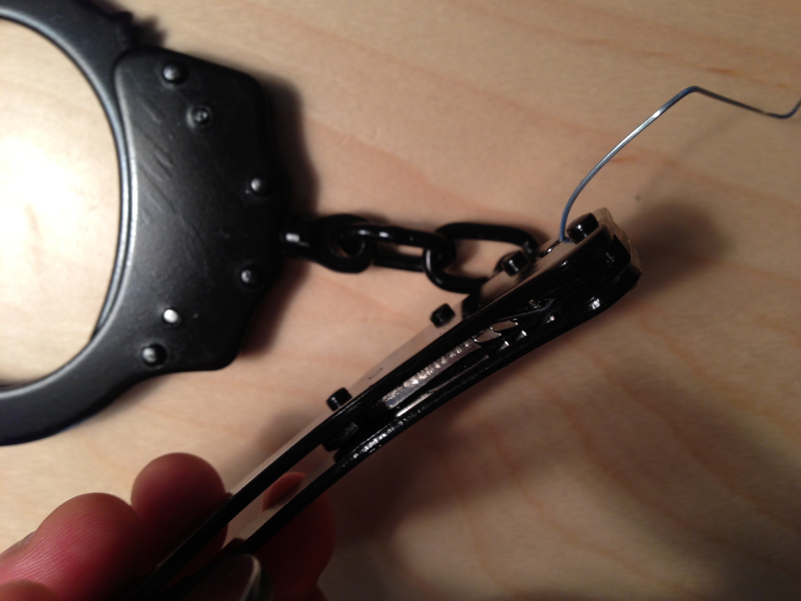 Bending a paperclip to open handcuffs