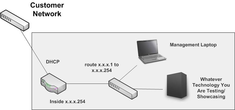 Over the years I’ve had to showcase many technologies in live testing / lab demo scenarios. To avoid risk of dealing with unknown elements, I try to own responsibility for as much of the testing environment as possible. A simple way to remove the unknown network out of the equation is using a router or firewall to mimic a standard user using PAT (port address translation) and handling everything on the inside test network.