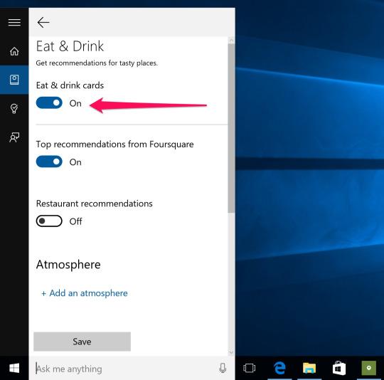 For example, if you don’t want any restaurant recommendations, you can select Eat & Drink and turn off Eat & Drink Cards. But you can also tell her to turn off Foursquare’s restaurant recommendations and turn on customized ones, based on the types of cuisine you like, how much you want to pay, and how far you’re willing to travel for some good eats. (You would, of course, have to supply all of that info to Cortana — she isn’t a mind reader, even if it sometimes seems that way.)