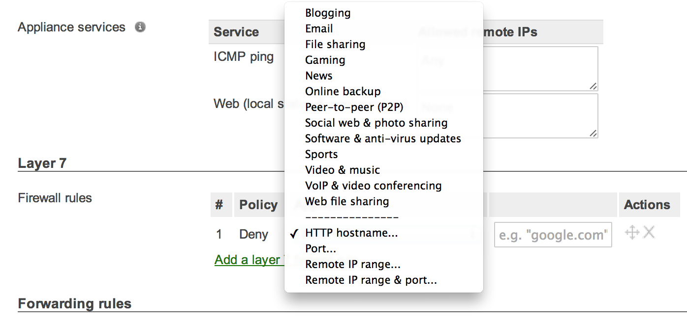 As a firewall, the MX60 offers standard access rules as well as layer 7 application layer controls. The next images show the default configuration pages for firewall rules.
