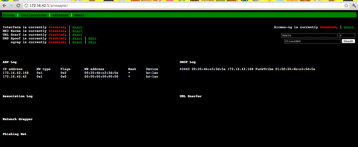 The WIFI Pineapple is pretty easy to setup. It has two LAN interfaces (pass through and admin access). It provides auto DHCP 172.16.42.X to the administrative interface. To access the main interface, a GUI located at 172.16.42.1. From here, the pen tester can enable many tools as well as see who is connecting to the WIFI Pineapple. Network setup is pretty easy and designed to pass traffic through without systems knowing the difference from the fake SSID or real network.