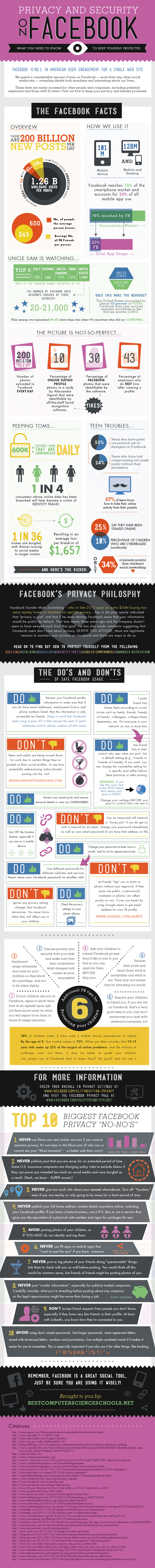 The Bestcomputerscienceschools.net (Link HERE) provided me a infographic covering privacy and security of Facebook. I really liked the research and agree with the suggested tips to use Facebook more security. Check it out.