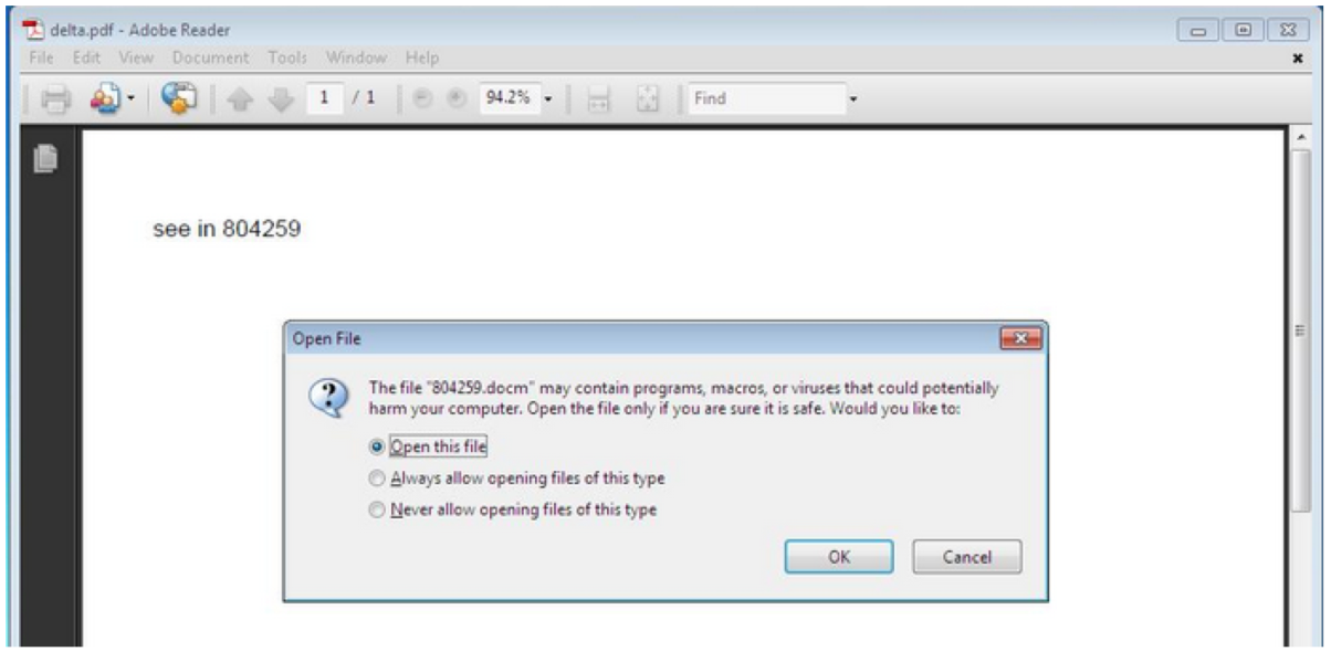The PDF has an attached document inside, which is trying to get opened by the Acrobat Reader:
