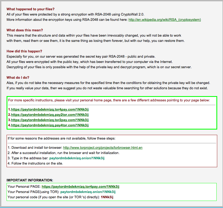 Provided the anti-VM and anti-emulation checks pass, the Cryptowall malware is decrypted and installed on the system. Once the system is infected, the user is presented a message similar to Figure 1.