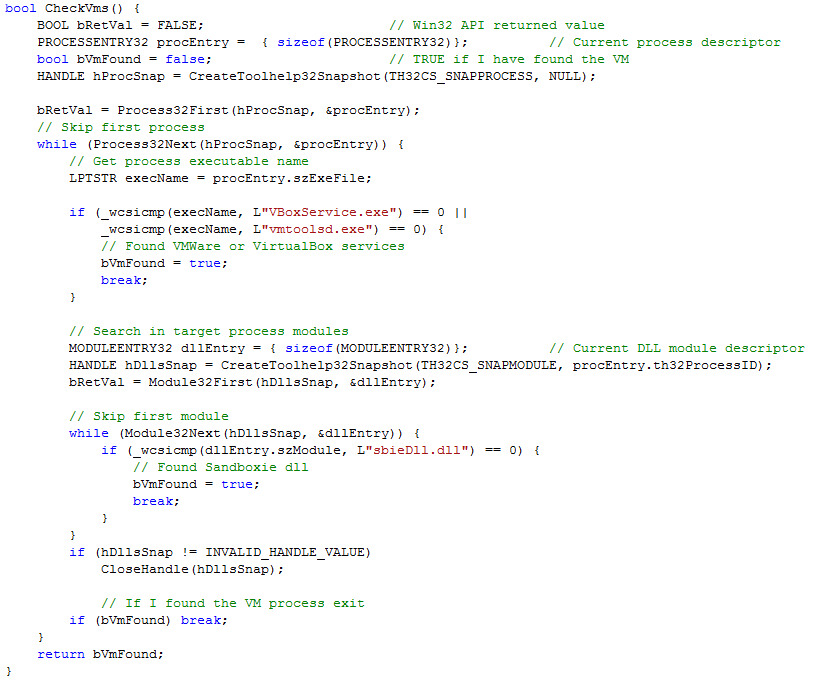 The Second stage is the last encryption layer code. It builds a simple Import Address Table (IAT), and implements multiple features. The most important one is the Anti-VM Check. The Anti-VM code is quite simple: