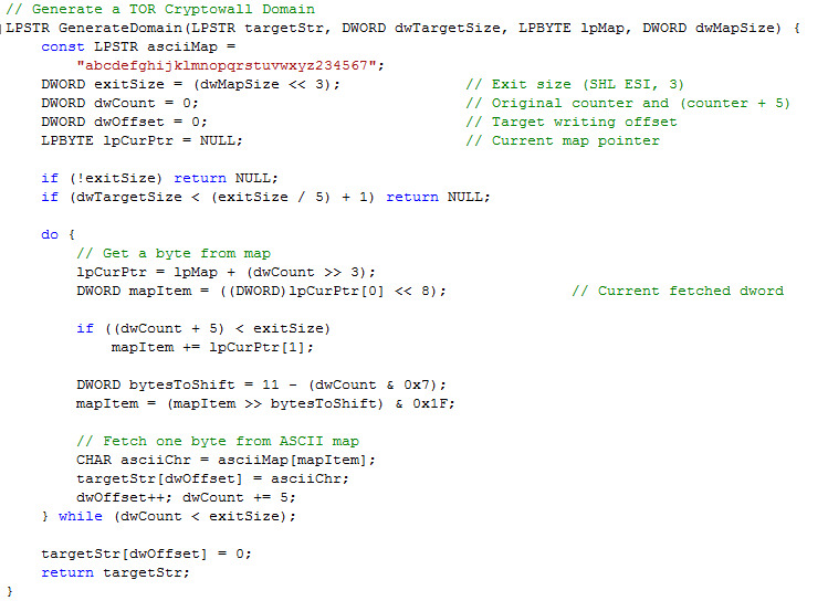 Using hardcoded IP address in the PE, the malware connects to the TOR Server with an encrypted SSL connection on port 443 or 9090. After successfully connecting, it starts to generate the Cryptowall domain names using a customized Domain Generation Algorithm (DGA). The algorithm is located at offset + 0x2E9FC.