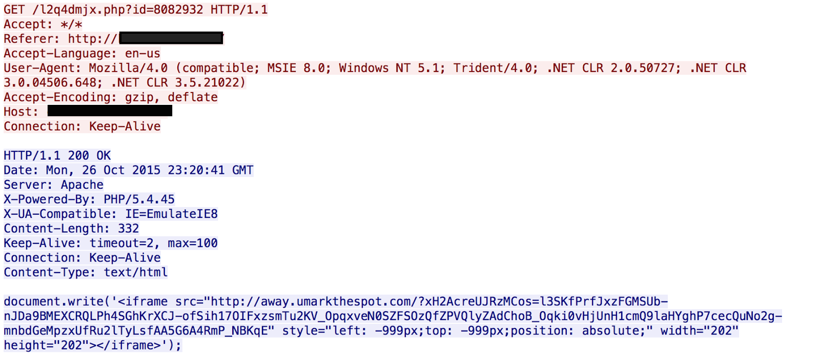 RIG compromises users like any exploit kit. It starts with a user being redirected to a landing page. This is done via malicious iframes or malvertising and looks similar the following: