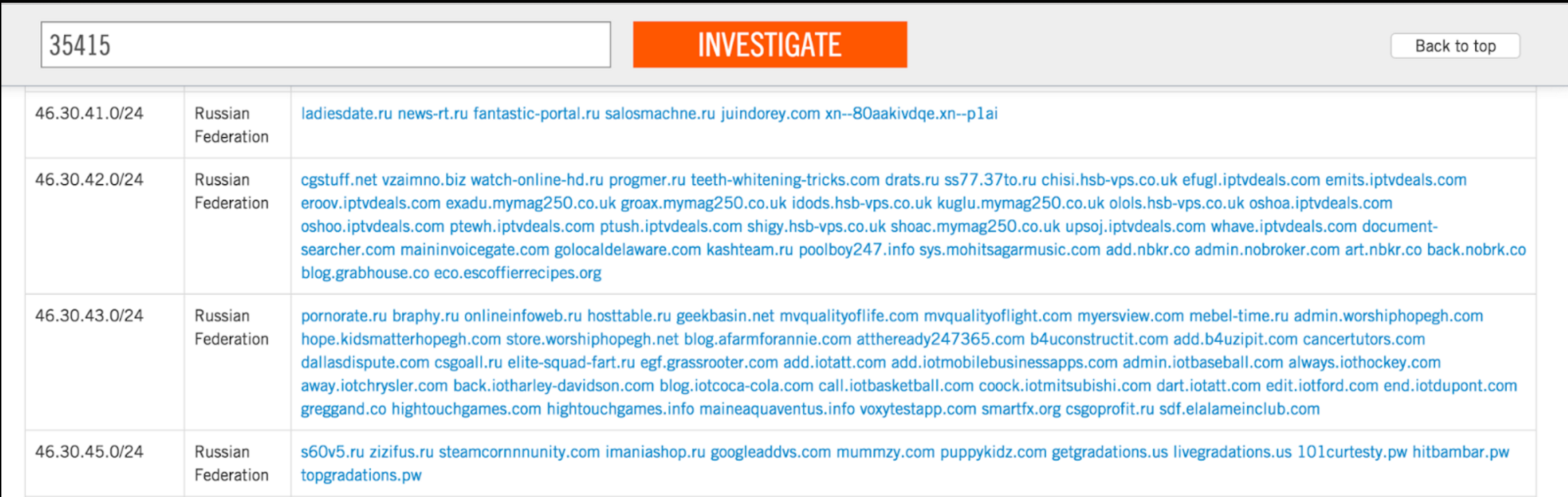 Since Eurobyte chose not to acknowledge or respond to our repeated messages we did a little further research on the activity associated with the provider. We worked with our research partners at OpenDNS Labs to get better visibility into the domains that were hosted. Based on our research we found a total of seven class C networks owned by the provider, with one of the class C’s serving as their corporate network. Based on the information from OpenDNS provided we found approximately 25,000 domains being hosted on this address space. These domains were heavily leveraging the Russian TLD (.ru), as expected. Three of the class C networks were seen serving RIG during the period. We took the domains that OpenDNS provided and queried them against Talos’s automated web reputation. We found that of the six class C address spaces that are being used by Eurobyte five were scored significantly negatively in web reputation. The only exception was one Class C network that was hosting the Russian payment platform e-autopay<dot>com.