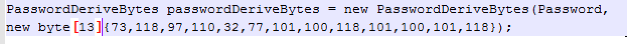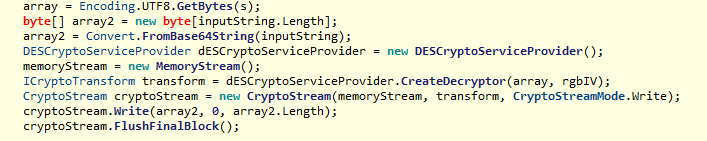 The loader is a very simple .NET assembly with no obfuscation. Comparing both the Initialization Vector (IV) and the code structure it seems like it may have been derived from an example posted on the Codeproject.com website.