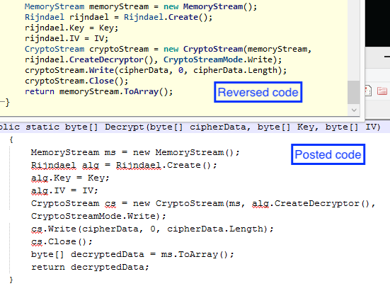 At the code level looking specifically at the function ‘Decrypt’, it is obvious that the code structure in the Codeproject source and the latest SamSam runner sample is the same (comments from the posted code were removed).
