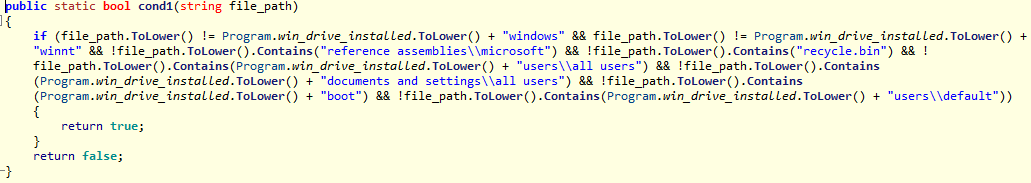 While previous SamSam versions used the API call DriveInfo.GetDrives() to obtain the list of available drives, this new version has the drive letters hardcoded. After checking that a drive is ready it starts a search for targeted files on the non-blacklisted folder paths.