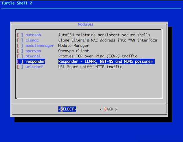 Once that is done, responder should show up on your module list with a X next to it representing that its ready to rock. Now you need to exit the turtle GUI to get you to the turtle CLI. This is where you will follow Mubix’s steps described below. Make sure to keep your Ethernet connection plugged in so you can dowload the opkg stuff!