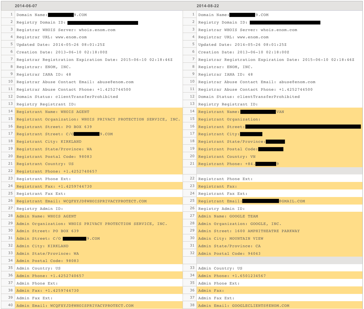 In mid-2013, a problem occurred that slowly began unmasking the hidden registration information for owners’ domains that had opted into WHOIS privacy protection. These domains all appear to be registered via Google App [1], using eNom as a registrar. At the time of writing this blog, there are 305,925 domains registered via Google’s partnership with eNom. 282,867 domains, or roughly 94% appear have been affected [2]. (Google reports that new domains which have not faced a renewal period are not affected and many businesses do not opt into their privacy service.) The information disclosed included full names, addresses, phone numbers, and email addresses for each domain. The information was leaked in the form of WHOIS records.