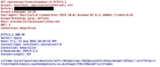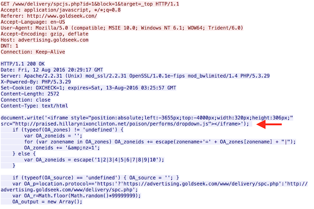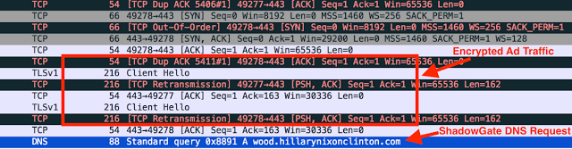 As we continued to investigate we started noticing a lot of .co.nz TLDs serving ads. One such example was particularly interesting because it added SSL to the mix. The site in question was theregister[.]co[.]nz, which is a news site for the retail industry in New Zealand. Initially it was unclear where the initial infection point came from since it appeared the redirection just appeared out of nowhere. As shown below you can see the DNS request for wood.hillarynixonclinton[.]net with some SSL preceding it.