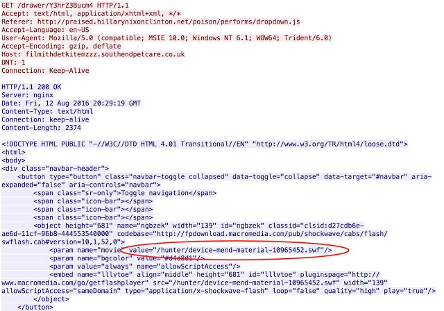 This is yet another Neutrino EK landing page rendering several feet to the left and several feet above the screen. This leads to the relatively “simple” landing page associated with Neutrino as shown below. The landing page performs some checks to establish if flash is installed and then downloads a malicious flash file that contains multiple exploits and compromises the user, as highlighted.