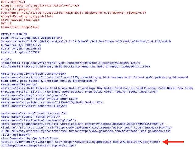 This infection run begins with a trip to a site related to precious metals and their values, goldseek[.]com. The user begins by browsing to the main URL associated with the site. The page loads as normal, but upon further analysis you can see that there is an ad generated from OpenX 2.8.7 as highlighted: