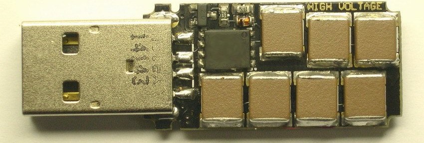 “The basic idea of the USB drive is quite simple. When we connect it up to the USB port, an inverting DC/DC converter runs and charges capacitors to -110V. When the voltage is reached, the DC/DC is switched off. At the same time, the filed transistor opens. It is used to apply the -110V to signal lines of the USB interface. When the voltage on capacitors increases to -7V, the transistor closes and the DC/DC starts. The loop runs till everything possible is broken down. Those familiar with the electronics have already guessed why we use negative voltage here. I‘ll explain to others that negative voltage is easier to commutate, as we need the N-channel field resistor, which, unlike the P-channel one, can have larger current for the same dimensions.