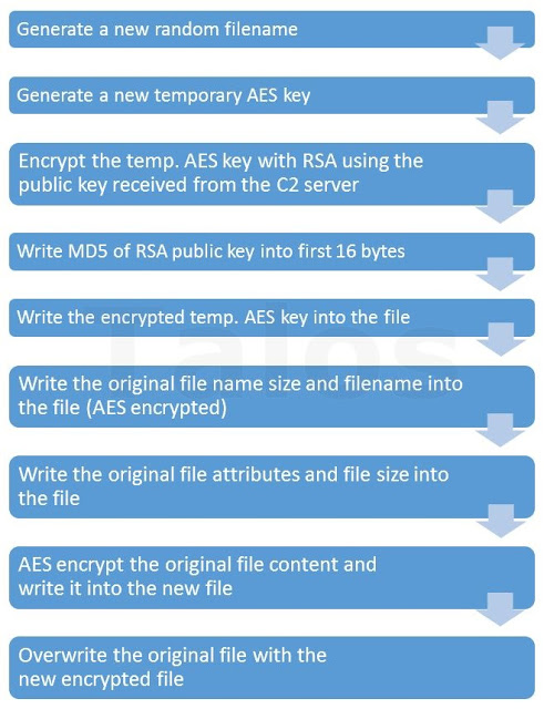 The MD5 hash of the public RSA-2048 key is written in the first 16 bytes of the encrypted file; then CryptoWall 4 writes the 256-bit encrypted stream. The original file attributes and size are written to the next eight bytes. The original file name is encrypted using the generated AES key and written with its size inside the new file.