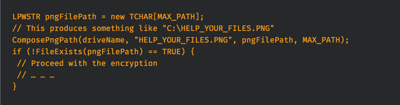Practically speaking, if the root path of the drive contains a file named “HELP_YOUR_FILES.PNG”, it will be skipped. We don’t know if this is a bug or a voluntary behavior. For each drive that passes the test, a new encryption thread is spawned (the thread argument is a small structure that contains a copy of the public key and a pointer to a string with the drive name).
