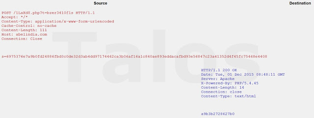 The network packet is sent to the web using a standard HTTP Post request, but is encrypted right before. The encryption algorithm is a custom one that uses a random string as key and produces a stream like the following one:
