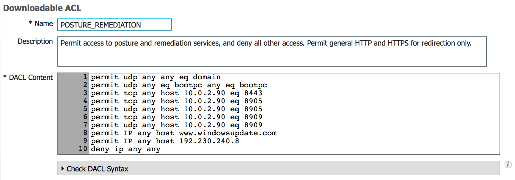 • ISE supports dynamic ACLs meaning you can place both employees and contractors on VLAN 10 however contractors can have an ACL placed to block specific things. That ACL can be something that is built in ISE and pushed down to the port level rather than calling an existing ACL that is already configured on the switch. Here is an example of a DACL pushed to a user needing to be redirected for a posture check. DACL_1
